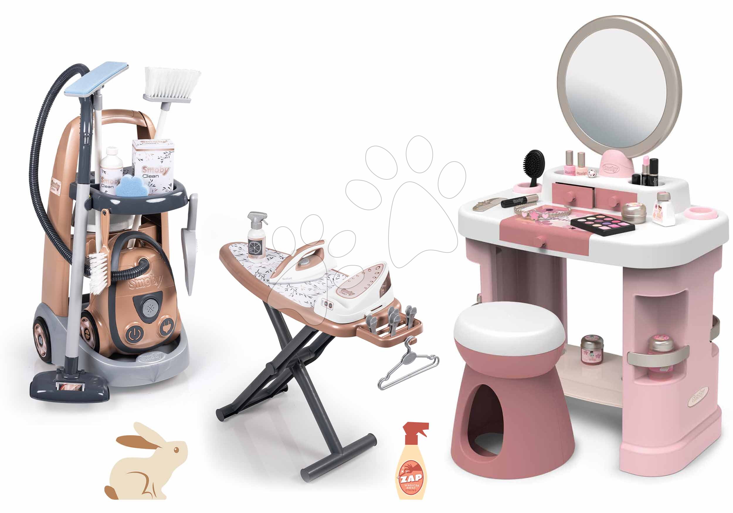 Takarítókocsi elektronikus porszívóval és pipere asztal vasalódeszkával egy igazán csodás játék szett minden gyerkőc részére már 3 éves kortól. Játékok a szettben színben és dizájnban kiegészítik egymást, csúcsminőségben pompáznak. Kisfiúk és kislányok saját háztartást alakíthatnak ki maguknak, megtanulnak takarítani, rendet rakni, porszívózni az elektronikus porszívóval és vasalni, mint a felnőttek. Kislányok értékelni fogják a pipere asztalt kiegészítőkkel, így magukra ölthetik akár a kozmetikus szerepét is. Játék szett a francia Smoby műhelyéből fejleszti a finom motorikát, logikus gondolkodást, és a gyerekek közelebb kerülnek a felnőttek világához.